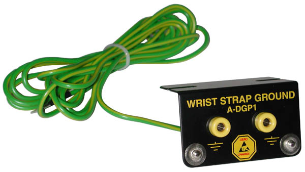 A-DGP1 Dual banana jack wrist strap grounding system with 10' cord A-DGP1-1 Dual banana jack wrist strap grounding system with 1 Mohm resistor and 10' cord Mounts under the front edge of a workstation and allows two operators to ground their wrist straps using standard banana jacks. Two 4 mm "parking studs" are provided for holding the wrist strap cord when the operator disconnects to go on breaks. The studs will prevent anyone from accidentally stepping on the cord when not in use. Comes complete with 10' grounding cord. |