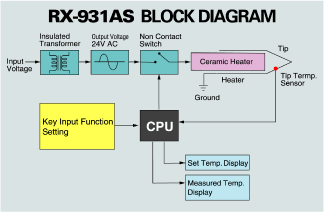 PID assures accurate temperature control. Functional new design.The RX-931AS series is a temperature control soldering station compliant with ISO 9000 series loaded with many features including PID control of the temperature, KEY LOCK control of the temperature setting and SLEEP MODE saving energy. FeatureDESIGNED WITH THE FOCUS ON