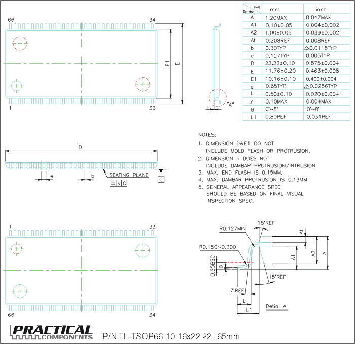 | Drawing | TII-TSOP66-10.16x22.22mm-.65mm | 66 | 10.16 x 22.22mm | .65mm | 44mm | 20mm | 1,000 |