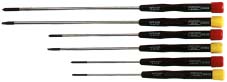 A 6 piece screwdriver set with 3 flat blades and 3 cross point screwdrivers. The screwdrivers have long shafts and are ideal for reaching recessed screws in electronic equipment. Handles are made from molded plastic, and incorporate finger grips. Shafts are made from nickel chrome molybdenum. Screwdrivers sizes: