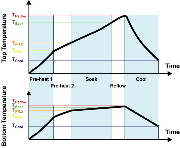 - 5 time/temperature zones for each profile PREHEAT 1, PREHEAT 2, SOAK, REFLOW and COOL DOWN + possibility to pre-program bottom pre-heat temperature in each zone.