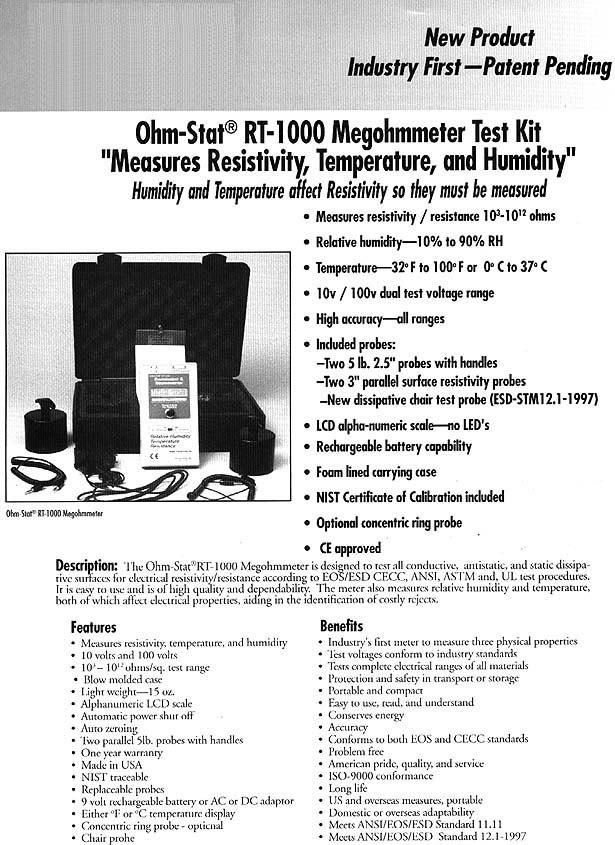 Humidity and temperature affect resistivity so they must be tested. The Ohm-Stat® RT-1000 tests