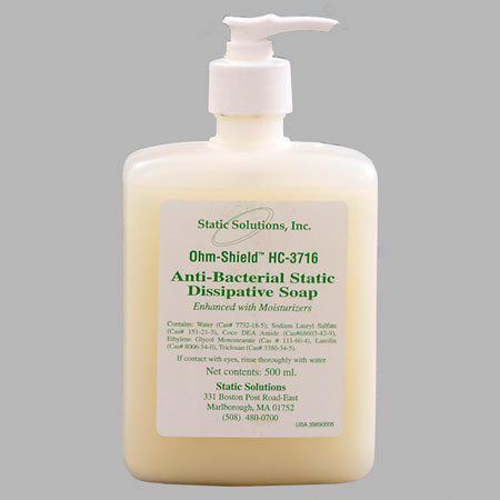 | Ohm-Stat hand soap is designed with natural moisurizers to kill gram positive and negative bacteria as it cleans and moisterizes the skin. The ultra rich soap is pH balanced to leave hands smooth and soft, even after frequent washings. Formulated with de-ionized water and filtered water, without silicon or parabens, it is ideal for cleanroom applications. | Features: