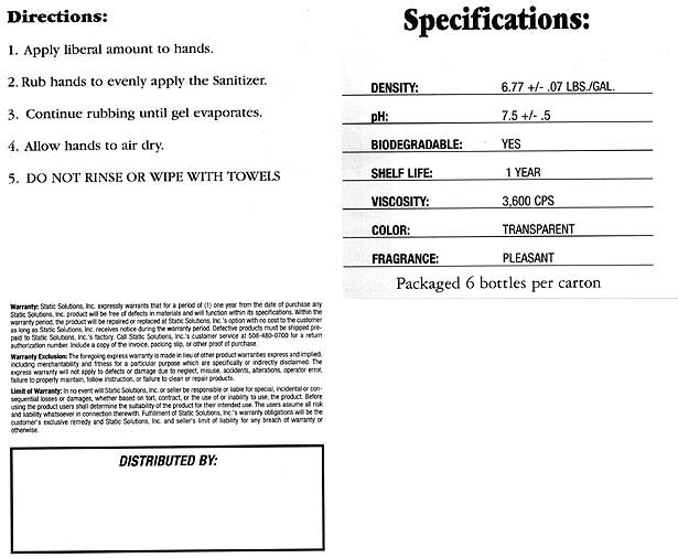| Ohm-Stat Hand Sanitizer is formulated to provide instant sanitation without the use of soap and water. The gel contains 60% ethyl alcohol which prevents bacterial transfer which is essential for electronic and food handling applications. Fortified with emollients, it will not dry hands. |