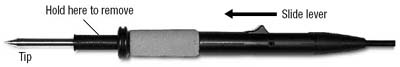 To remove the soldering iron tip, slide the lever in the direction of the arrow. The tip will then protrude from the hand-piece and can be removed easily by holding and pulling the plastic body of the integrated tip/heater.
