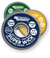 efficiently than conventional desoldering braids. No Clean. Static free bobbins.