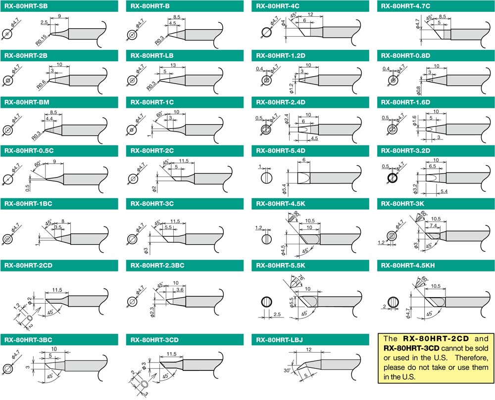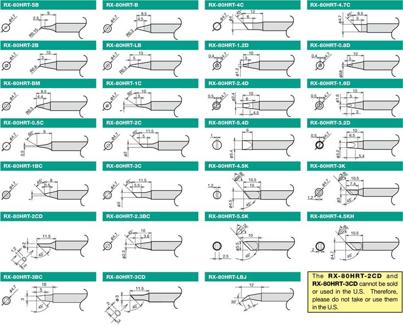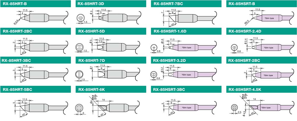RX-85HRT series [150W]Applicable Soldering Unit : RX-85GAS Note: Since the heater is integrated in the tip, replacement of only the heater or the tip is not possible. |